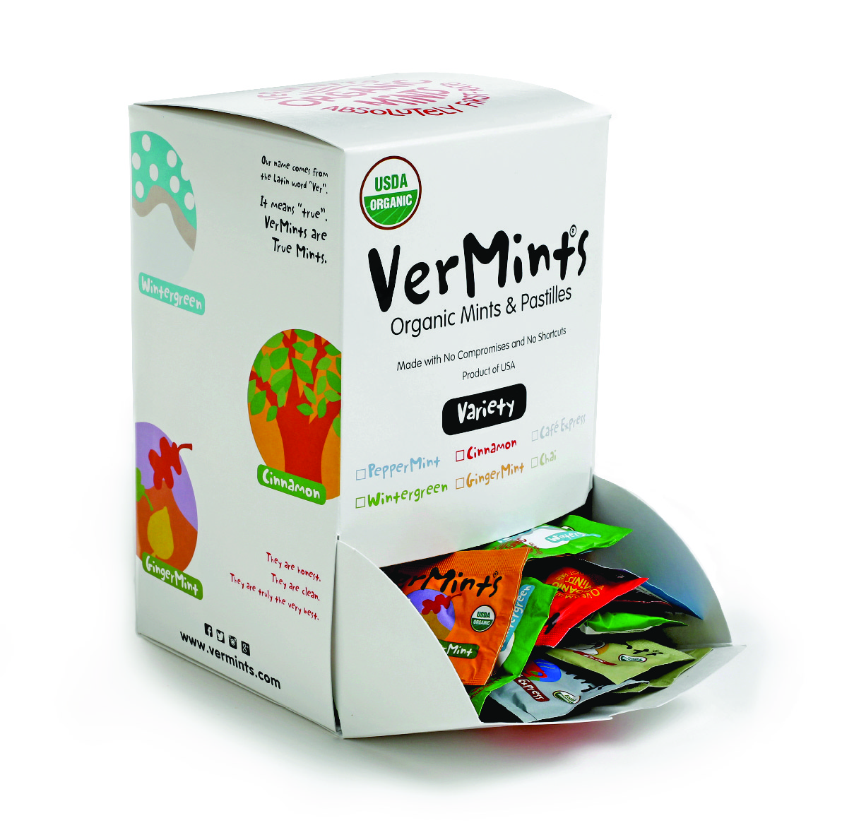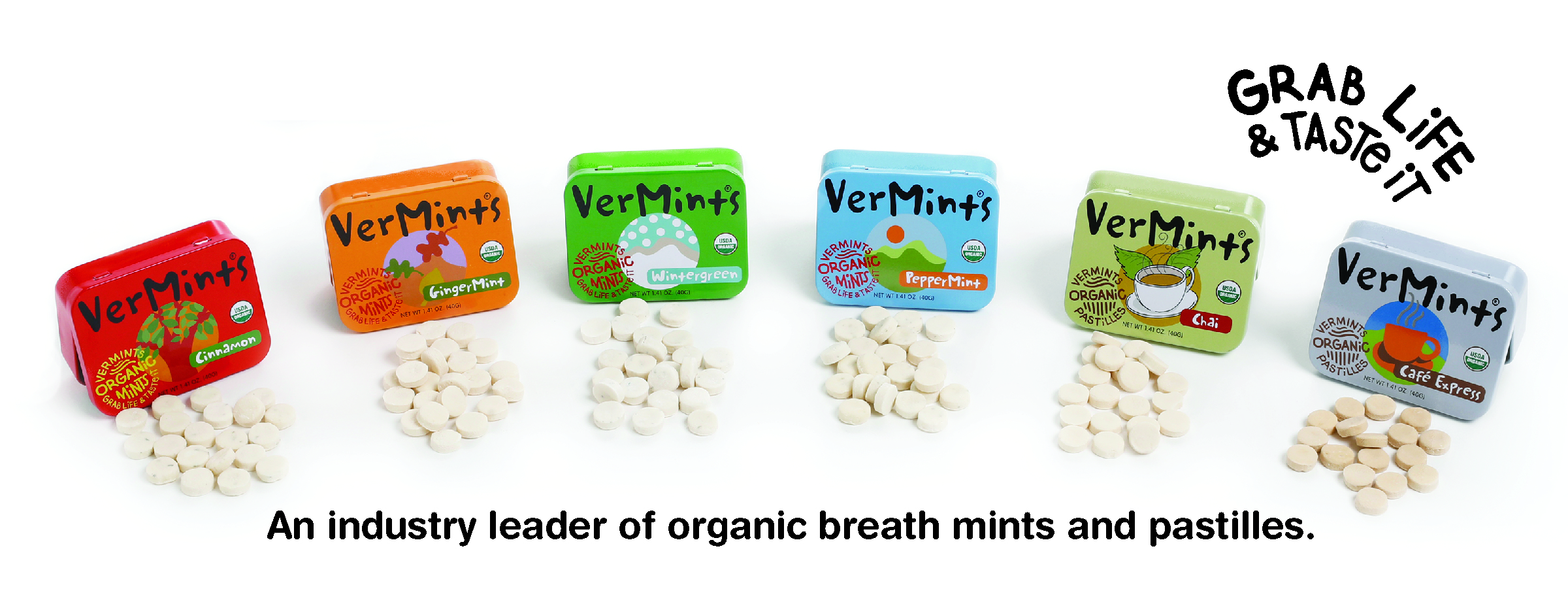 The leading U.S. manufacturer of quality, organic breath mints and pastilles. Our name comes from the Latin word “Ver”. It means true. VerMints are True Mints. The pure alternative to traditional breath fresheners that caters to the needs and desires of health-conscious consumers. Developed with focus on “free from” allergens and clean ingredient deck. Our lozenge shaped mints and pastilles are made without artificial flavorings, sweeteners, or colors, and instead contain high-quality, 100% organic ingredients. Experience VerMints, Grab Life and Taste it! Product of USA.