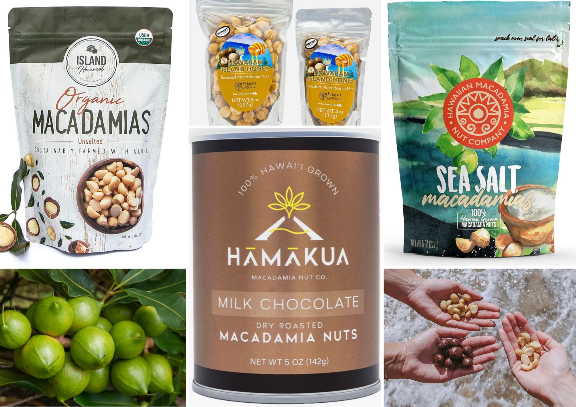 Hawaii-grown macadamia nuts: plain (for baking), roasted and salted, flavored and glazed, and chocolate covered.